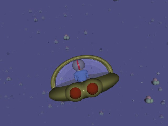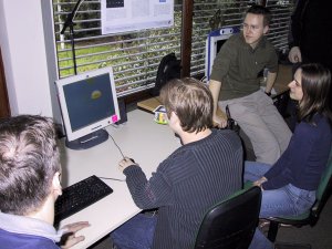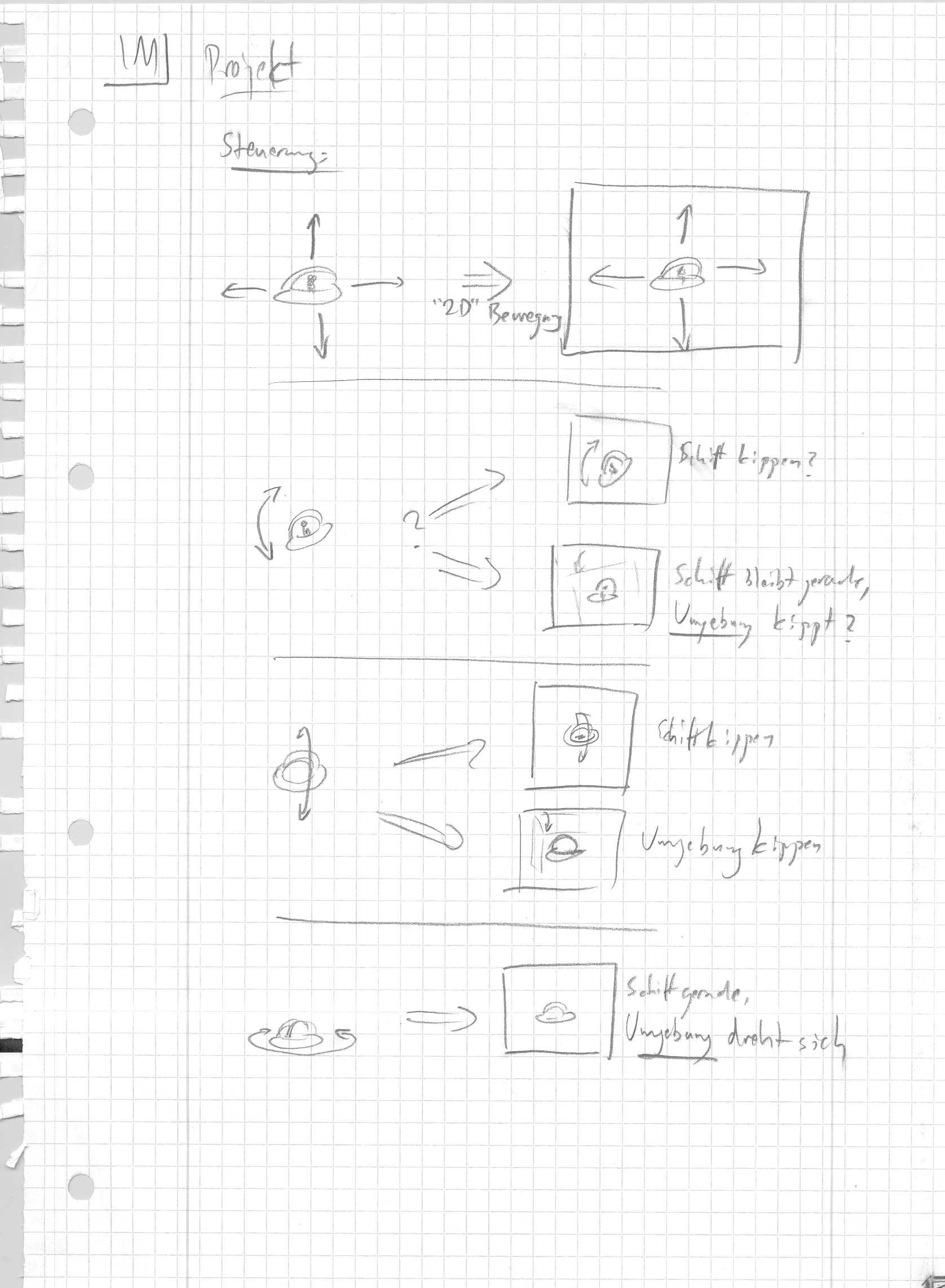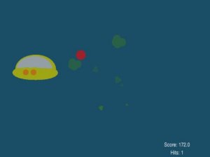 Spielansicht - Links im Bild das Microship | Interaktive Kontrolle in Aktion: Der Spieler hält in der linken Hand die Maus (Foto-Auslöser) und in der rechten das Microship-Modell, dessen räumliche Position aus der Bilderkennung des auf der Oberseite angebrachten Markers durch die über dem Monitor an einem Stativ angebrachte Kamera berechnet wird. |